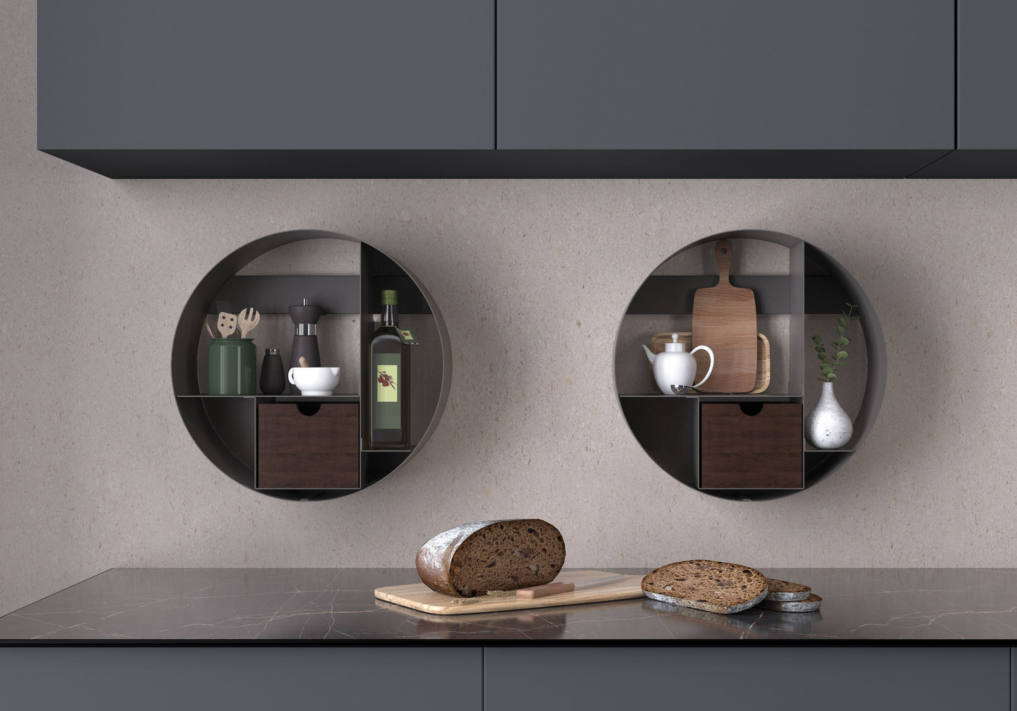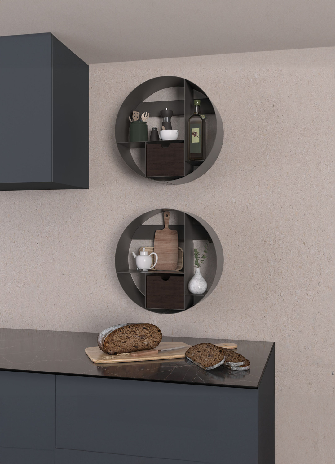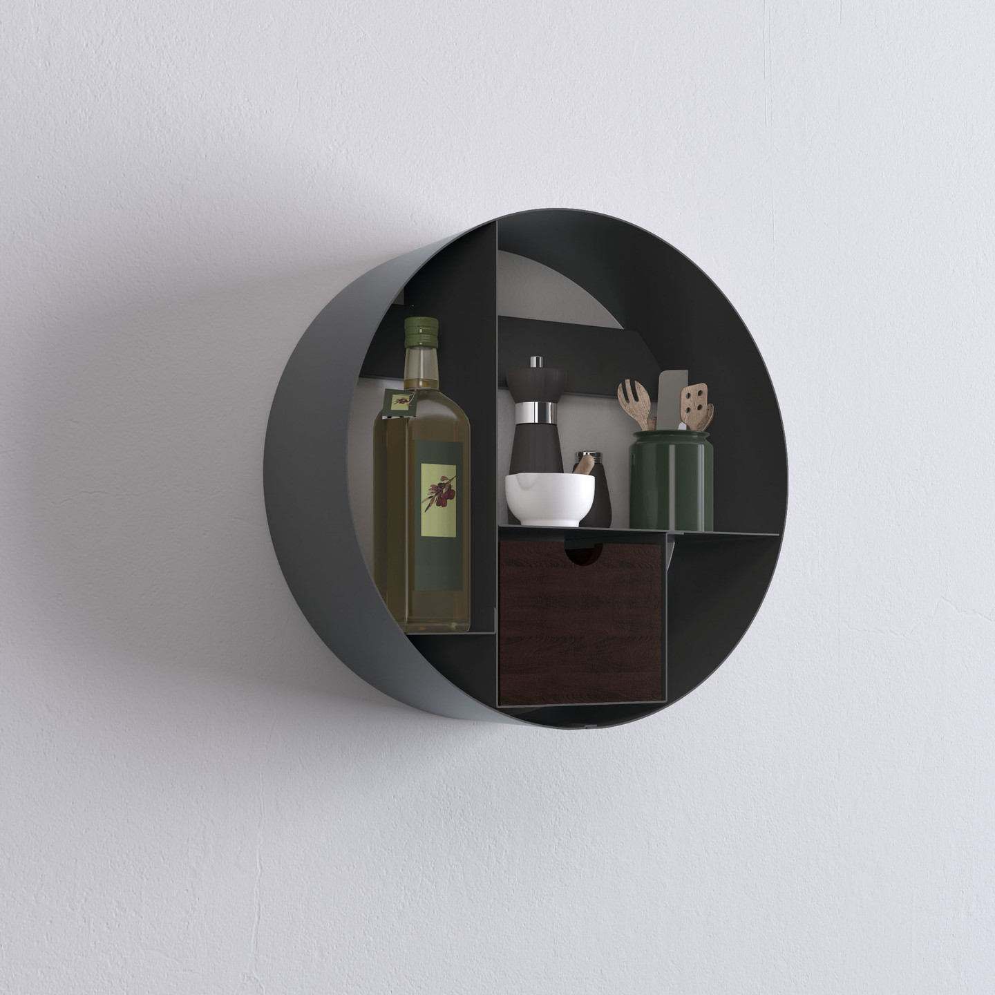 Une solution astucieuse de rangement pour les accessoires. Cette étagère murale ronde est disponible en version 100% métal et en version avec un tiroir en hêtre.