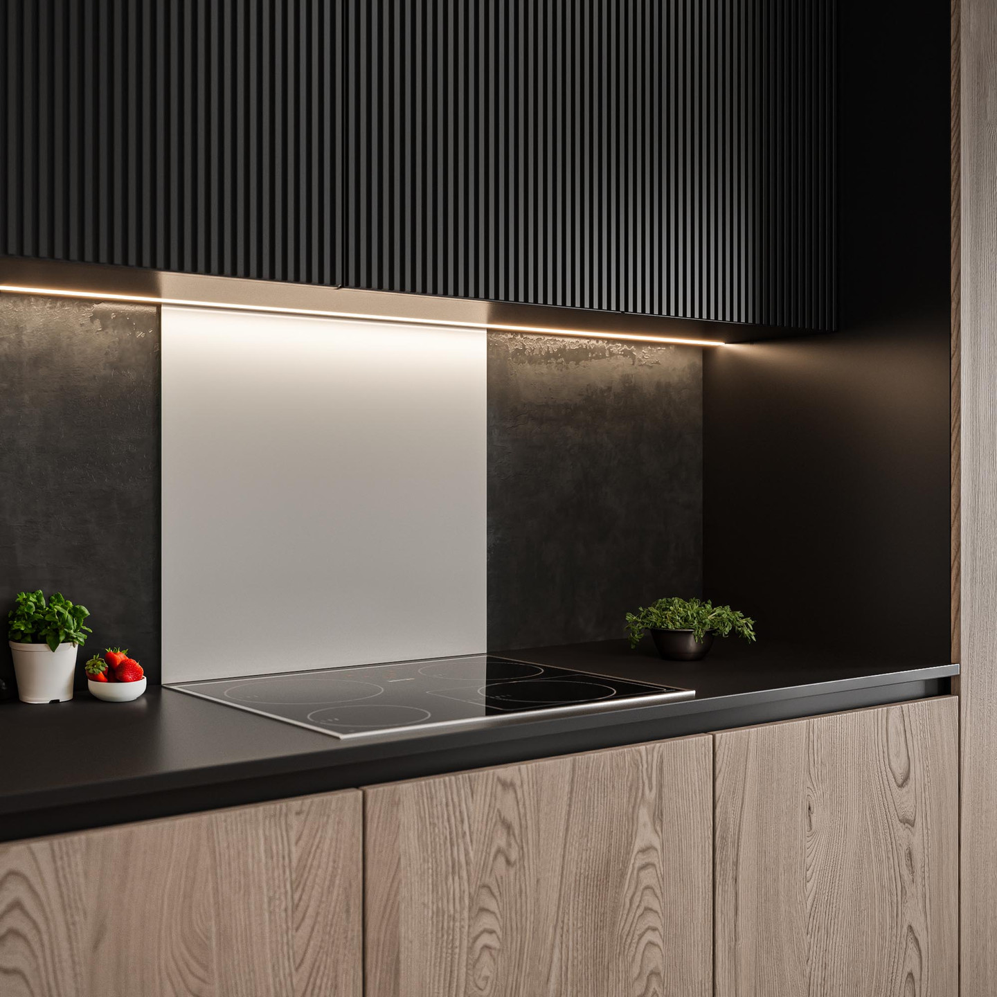 Fond de hotte en verre trempé 6 mm. Distance minimum de 80 mm avec la plaque de cuisson. Profondeur plan de travail minimum recommandé 650 mm. Fixation collage par silicone transparent. Fabrication française.