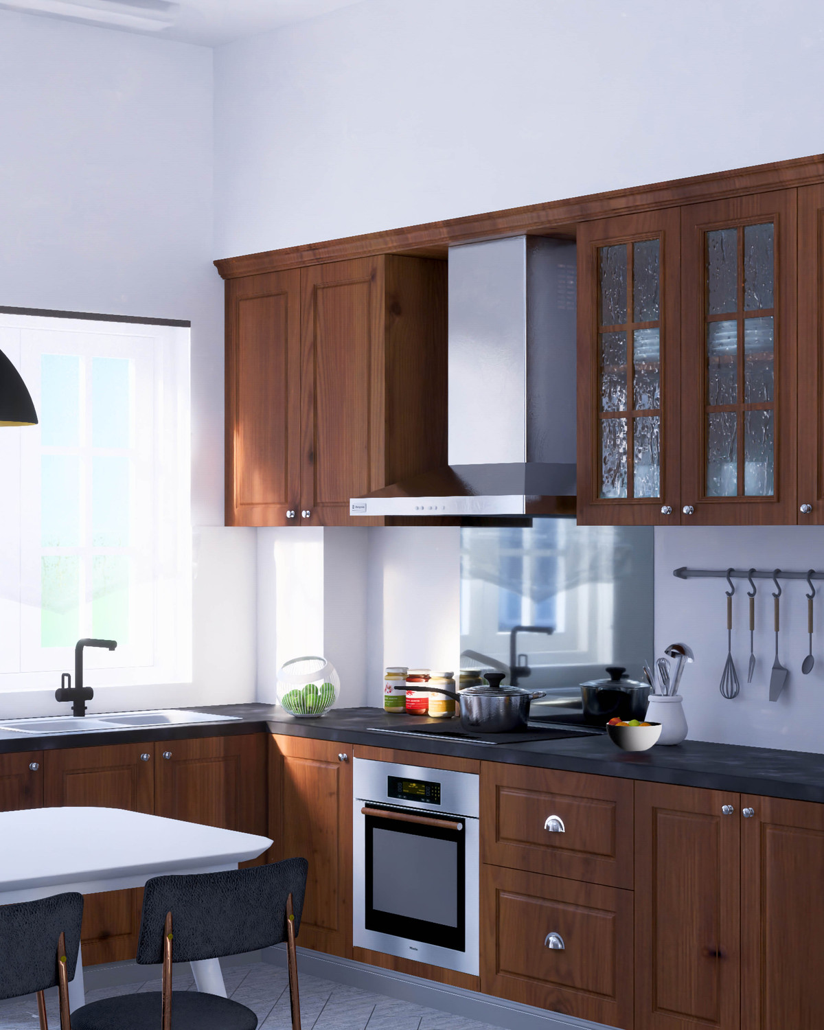 Fond de hotte en verre émaillé. Distance minimum de 80 mm avec la plaque de cuisson. Profondeur plan de travail minimum recommandé 650 mm. Fixation collage par silicone transparent.