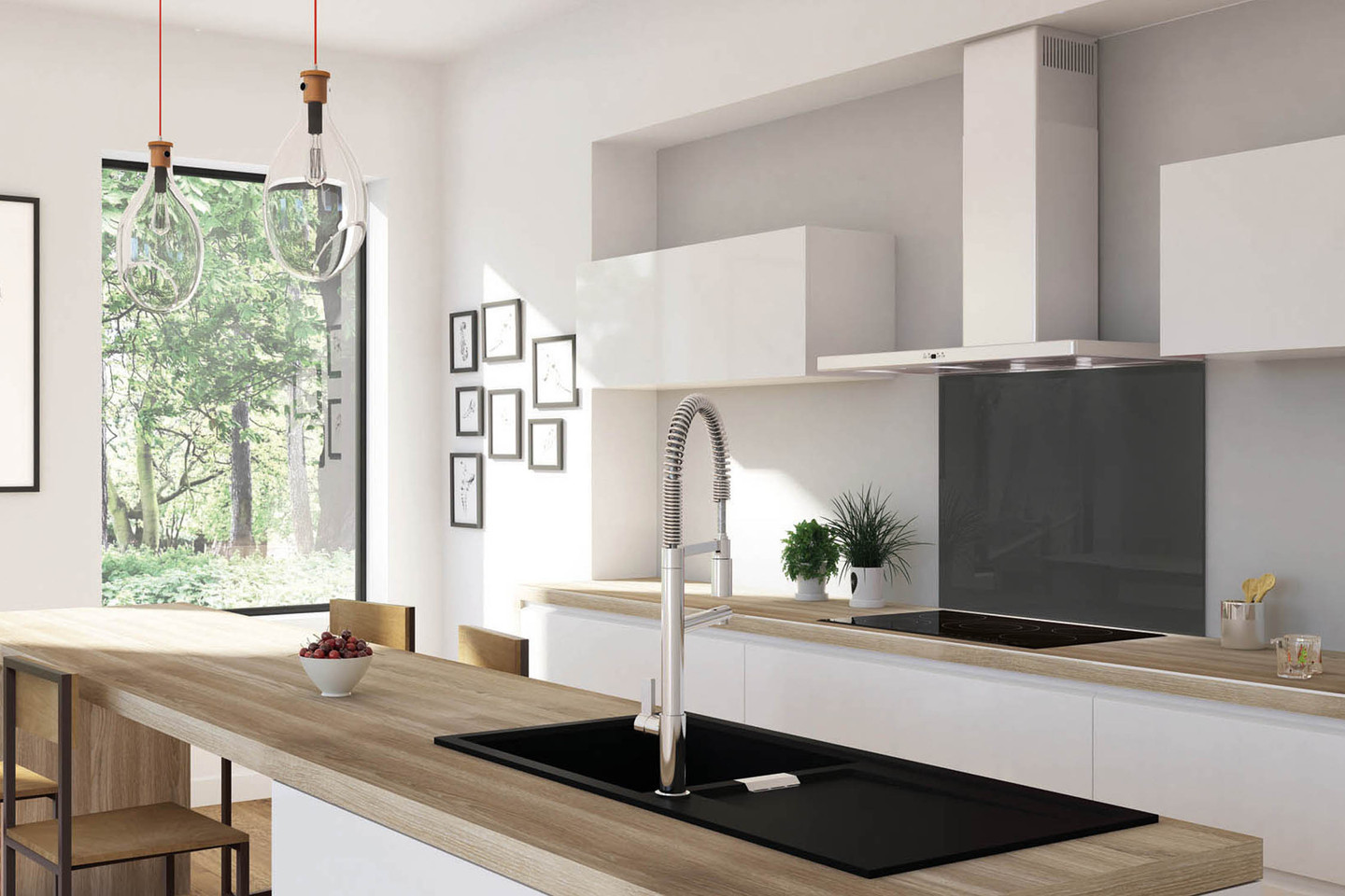 Fond de hotte en verre émaillé. Distance minimum de 80 mm avec la plaque de cuisson. Profondeur plan de travail minimum recommandé 650 mm. Fixation collage par silicone transparent.