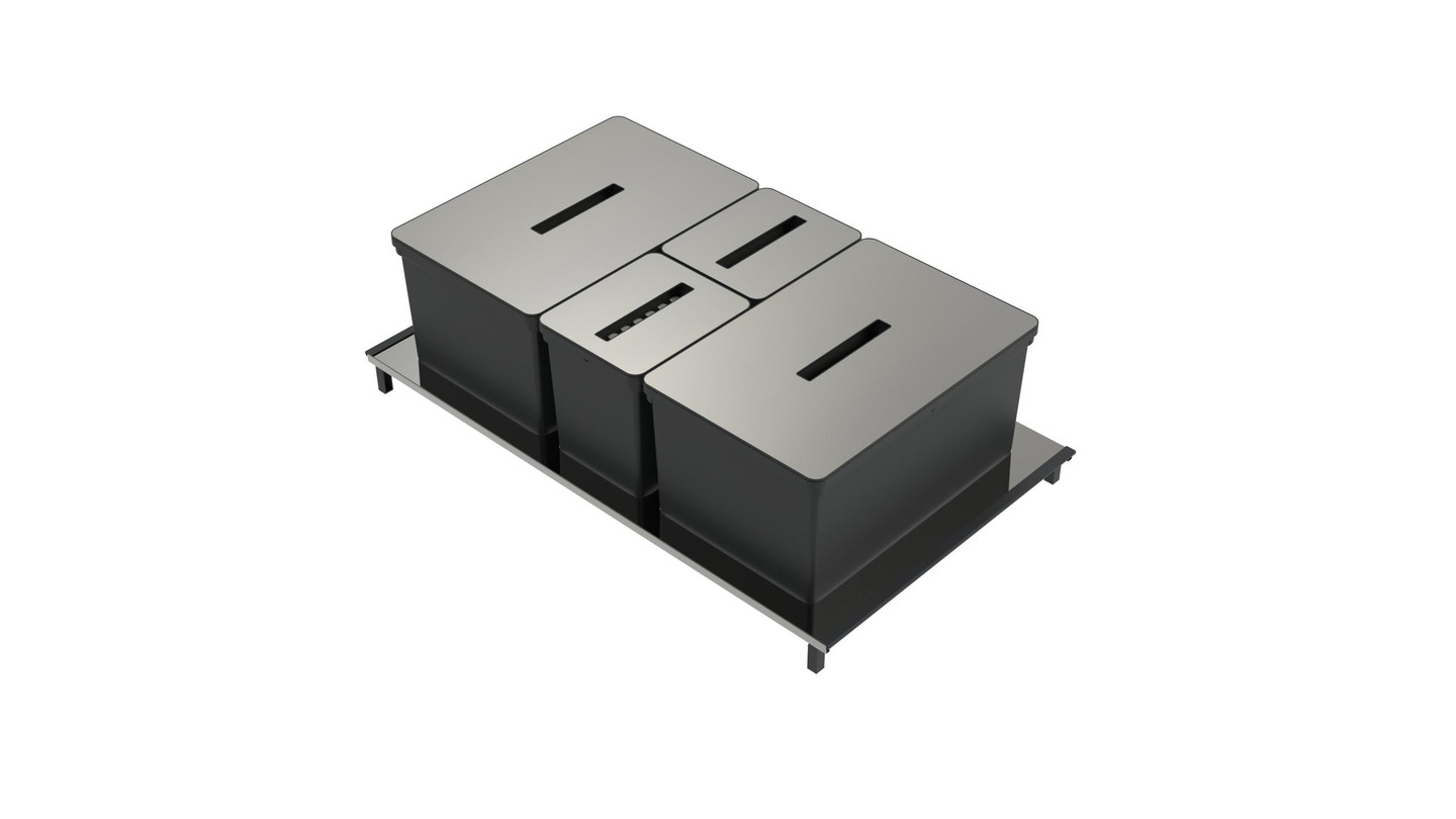 Poubelles avec socle ajustable à poser dans un tiroir, pas de fixations sur meuble ou porte. Solution compostage avec filtre sur le couvercle. Filtre en tissu pour le composteur, avec une durée d'absorption de 3 mois pour les odeurs. Filtre lavable à la main pour régénération, garanti jusqu'à 20 lavages.