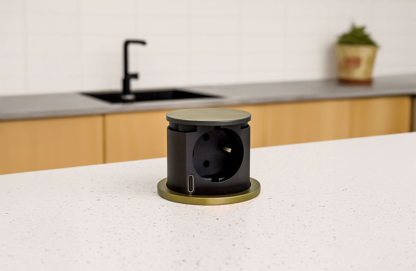 Prise à encastrer à ouverture automatique. Bloc ultra-compact de seulement quelques centimètres d’épaisseur, Tiny intégre une nouveauté : l’ajout d’un port USB-C. Désormais disponible en version 1 prise + 1 USB-C pour un encombrement encore plus réduit.