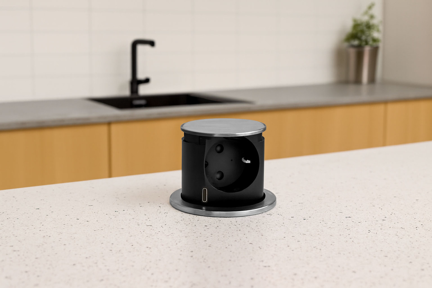 Prise à encastrer à ouverture automatique. Bloc ultra-compact de seulement quelques centimètres d’épaisseur, Tiny intégre une nouveauté : l’ajout d’un port USB-C. Désormais disponible en version 1 prise + 1 USB-C pour un encombrement encore plus réduit.