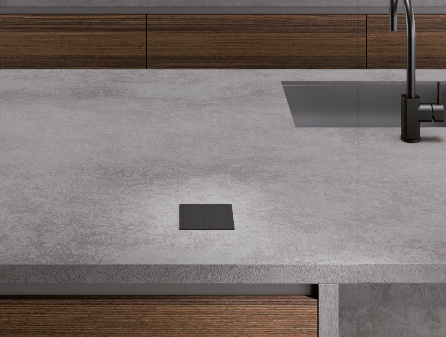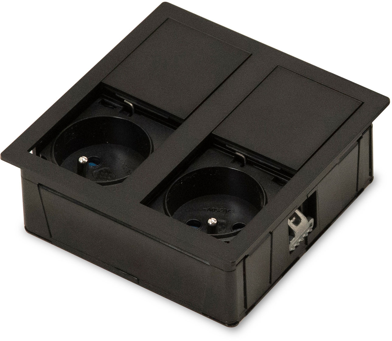 Double prise carrée avec ouvertures indépendantes. Système d'ouverture mécanique par pression. Le socle est fixe donc pas de frottement sur le plan de travail.