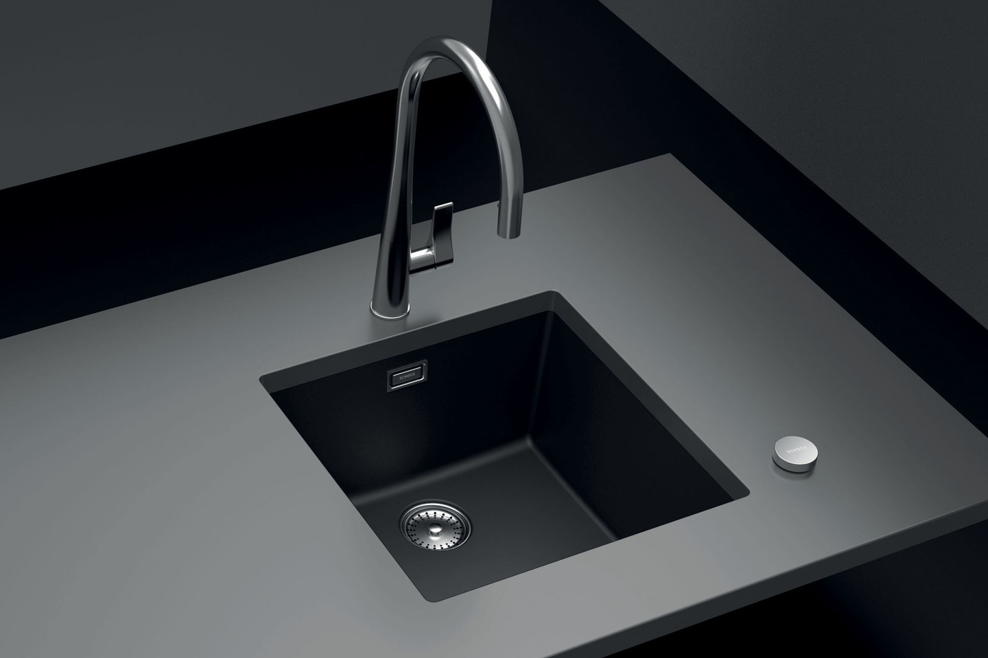 Rayons de découpe sous plan : 9 mm. Cuve sous-plan Luisidiam avec vidage manuel perfect drain. En option : bonde 84 mm et trop-plein finition Gun metal AV400050088, finition Cuivre AV400050094, finition Or AV400050018. Disponible en version à encastrer avec le kit AEFIX630194.