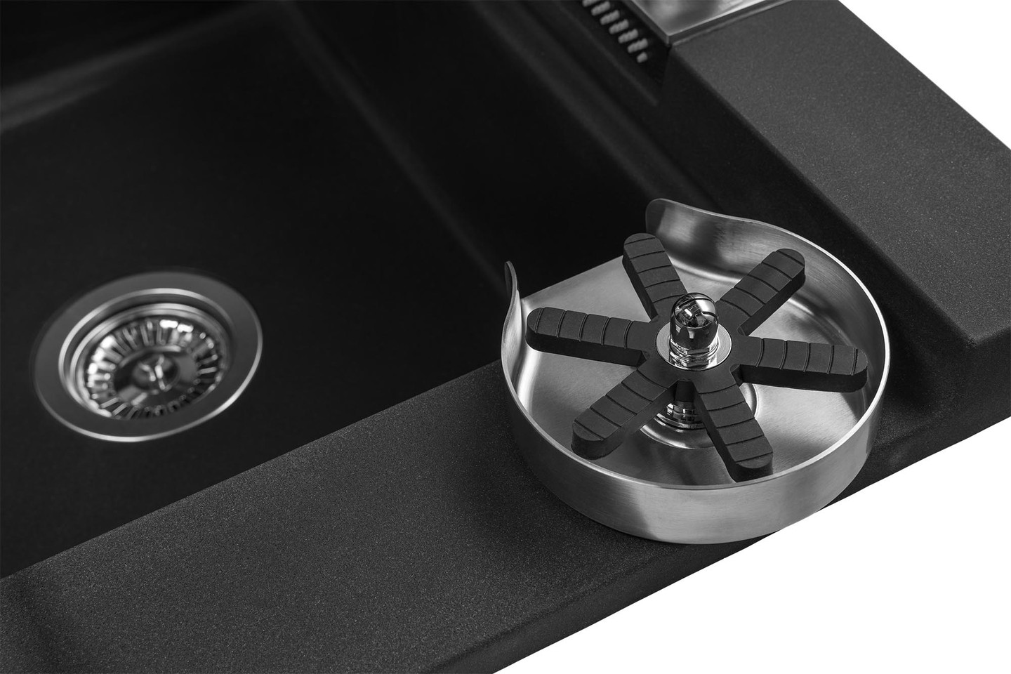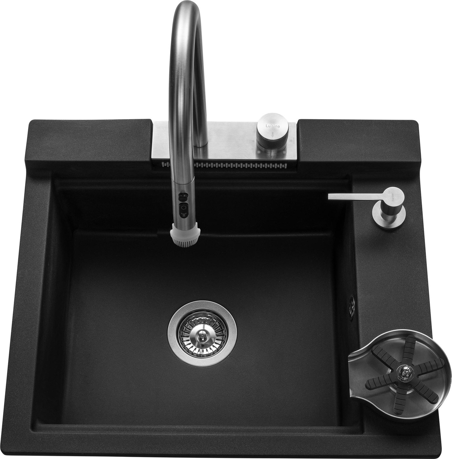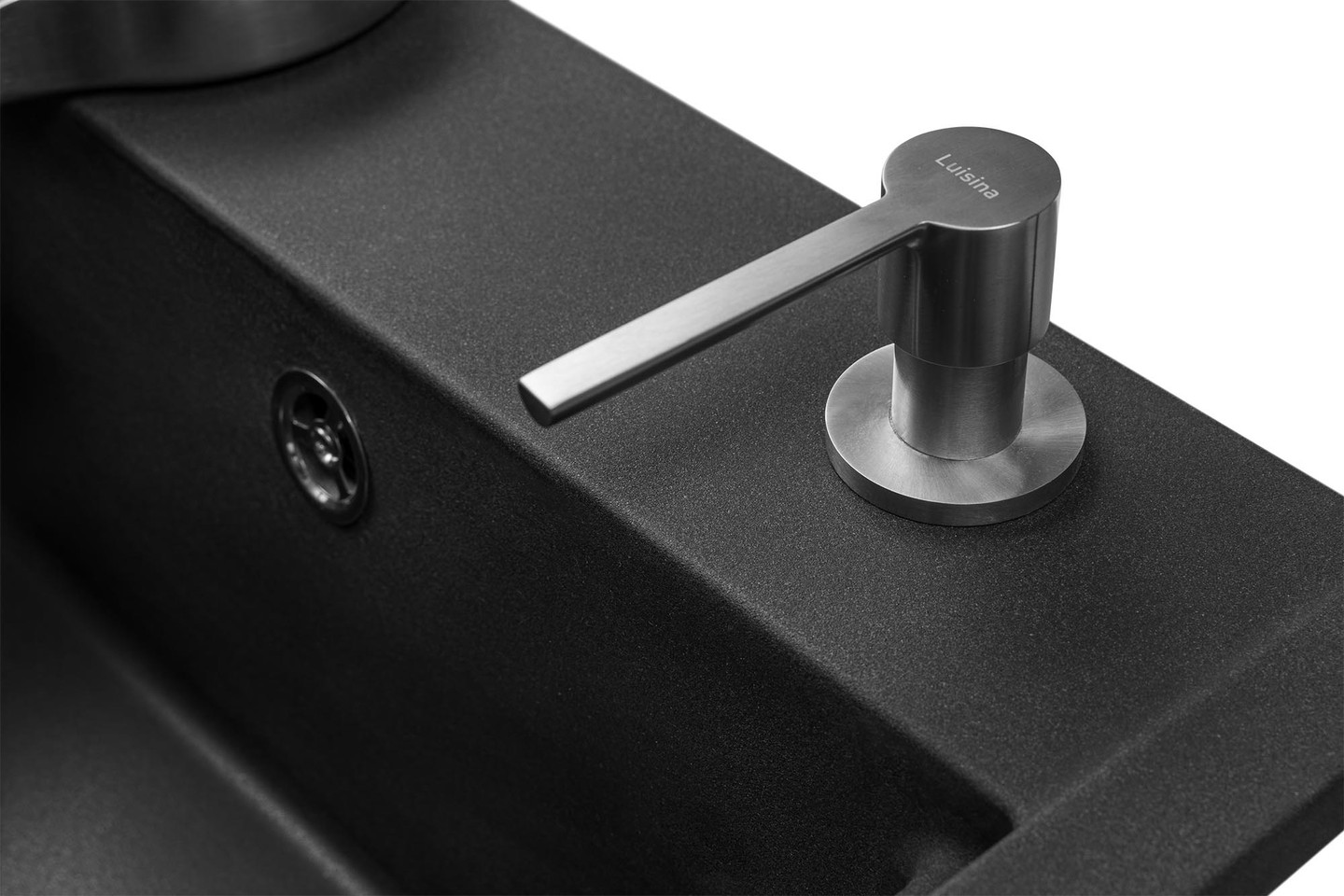 Cuve à encastrer Luisigranit avec vidage manuel chromé. Accessoires livrés de série : planche à découper, distributeur de savon ou de liquide vaisselle, rince-verre, mitigeur douchette avec brosse amovible comprenant un jet intensif, un jet pluie, un mode éco et un jet supplémentaire en cascade, idéal pour les fruits et légumes. Les positions du rince-verre et du distributeur peuvent être inversés. Débit du mitigeur : 5L/min (à 3 bars), débit de la cascade : 10.3L/min (à 3 bars).