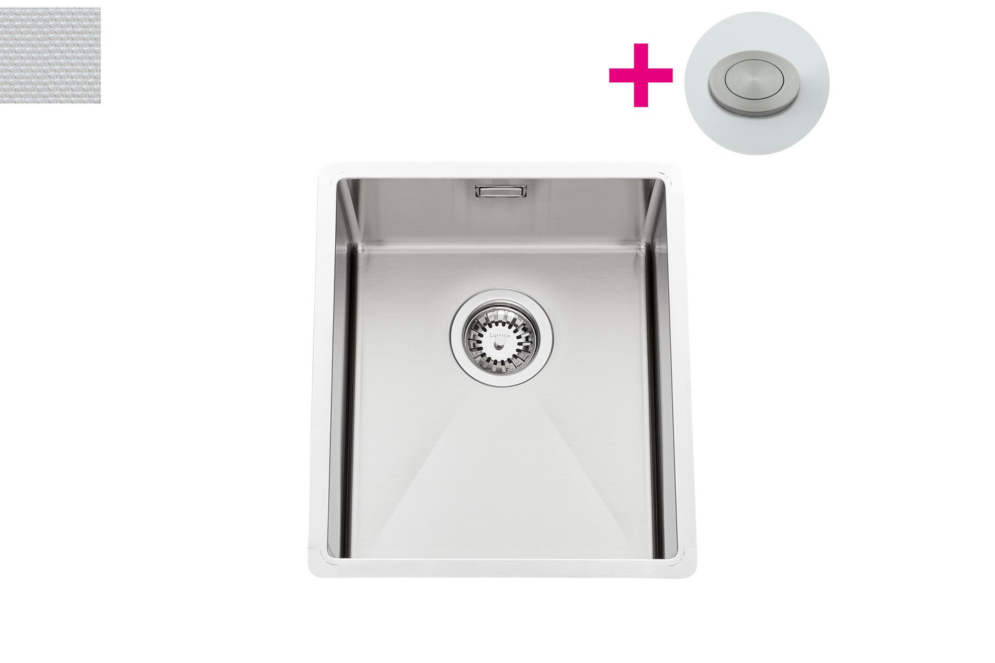 Diamètre de perçage pour la manette de vidage : 35 mm. Cuve sous-plan Luisinox avec vidage automatique bouton poussoir satiné.