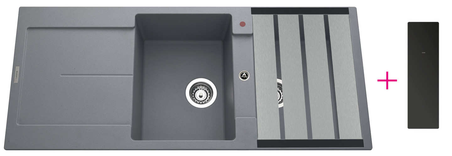 Evier à encastrer Luisigranit avec vidage manuel chromé et planche Duoline AEPLA7004075 et sa surface à découper en verre noir.