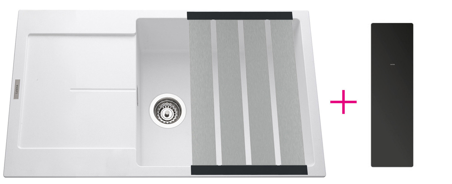 Evier à encastrer Luisigranit avec vidage manuel chromé et planche Duoline AEPLA7004075 et sa surface à découper en verre noir.