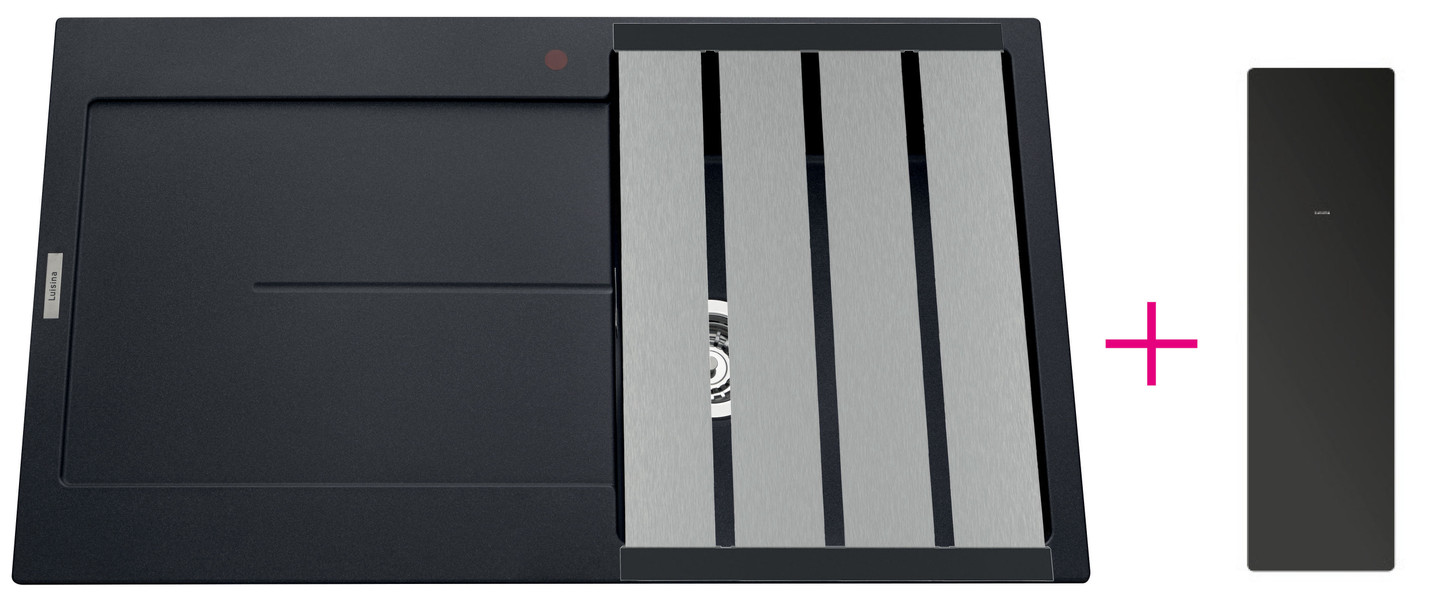 Evier à encastrer Luisigranit avec vidage manuel chromé et planche Duoline AEPLA7004075 et sa surface à découper en verre noir.