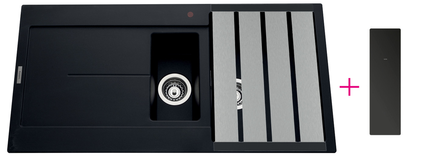 Evier à encastrer Luisina 1 bac, 1 vide-sauce, 1 égouttoir coloris Full Black et planche Duoline Inox brossé