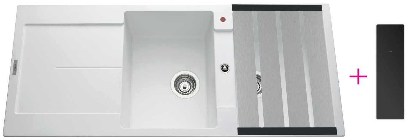 Evier à encastrer Luisigranit avec vidage manuel chromé et planche Duoline AEPLA7004075 et sa surface à découper en verre noir.