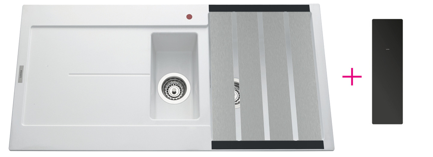 Evier à encastrer Luisigranit avec vidage manuel chromé et planche Duoline AEPLA7004075 et sa surface à découper en verre noir.