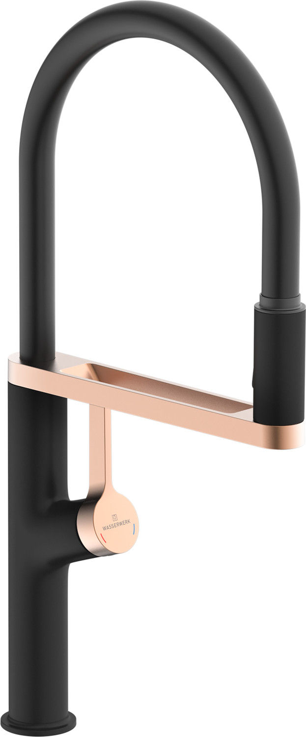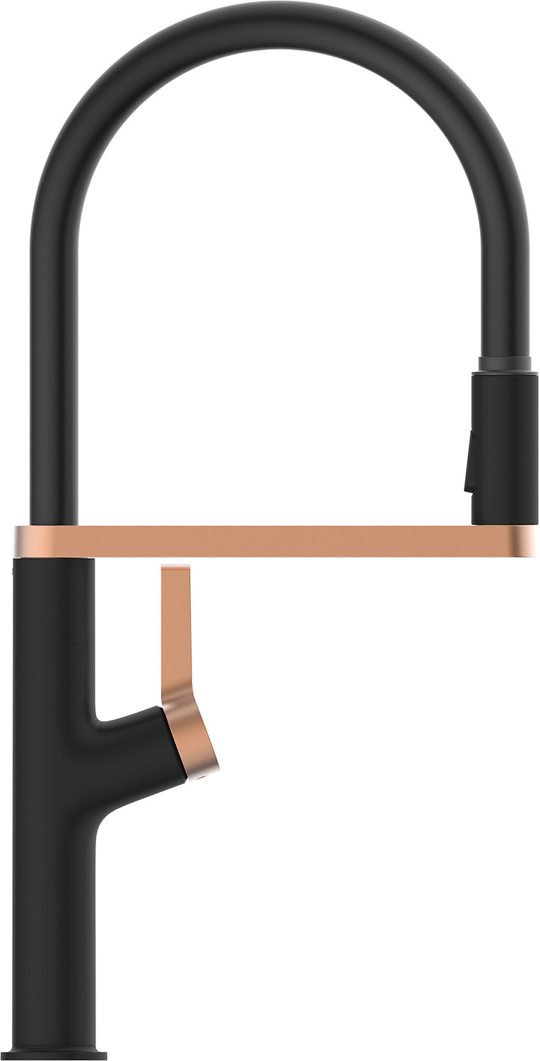Mitigeur de cuisine Luisina, bec pivotant noir mat et or rose PVD avec douchette mobile double jet