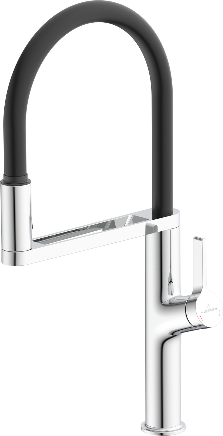 Mitigeur avec cartouche céramique, débit à 6,7L/mn à 3 bars. Flexibles fixes. Démarrage Cool Start, avec position centrale en ouverture eau froide pour des économies d'énergie. La douchette double jet, équipée de mousseur Néoperl inclus, repose sur un support magnétique.